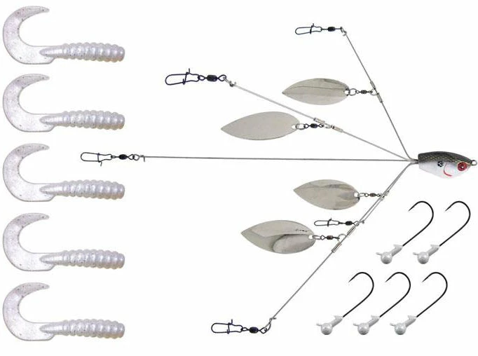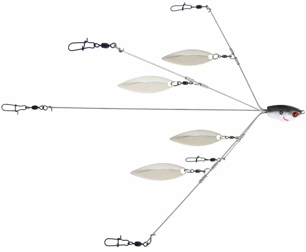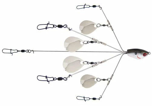 More flash means more fish! Simply an ultralight version of the Flash Mob, the Yum Yumbrella Flash Mob Jr Umbrella Rig has all the features that make Yumbrella the leader in its category. Featuring a super tough, stainless steel, heat-treated wire, strong snaps, and swivels. The ultralightweight of this umbrella rig allows it to be thrown on any type of rod and reel! Adding blades midway down each outer arm produces tremendous flash and vibration and creates the image of a bigger school of baitfish.