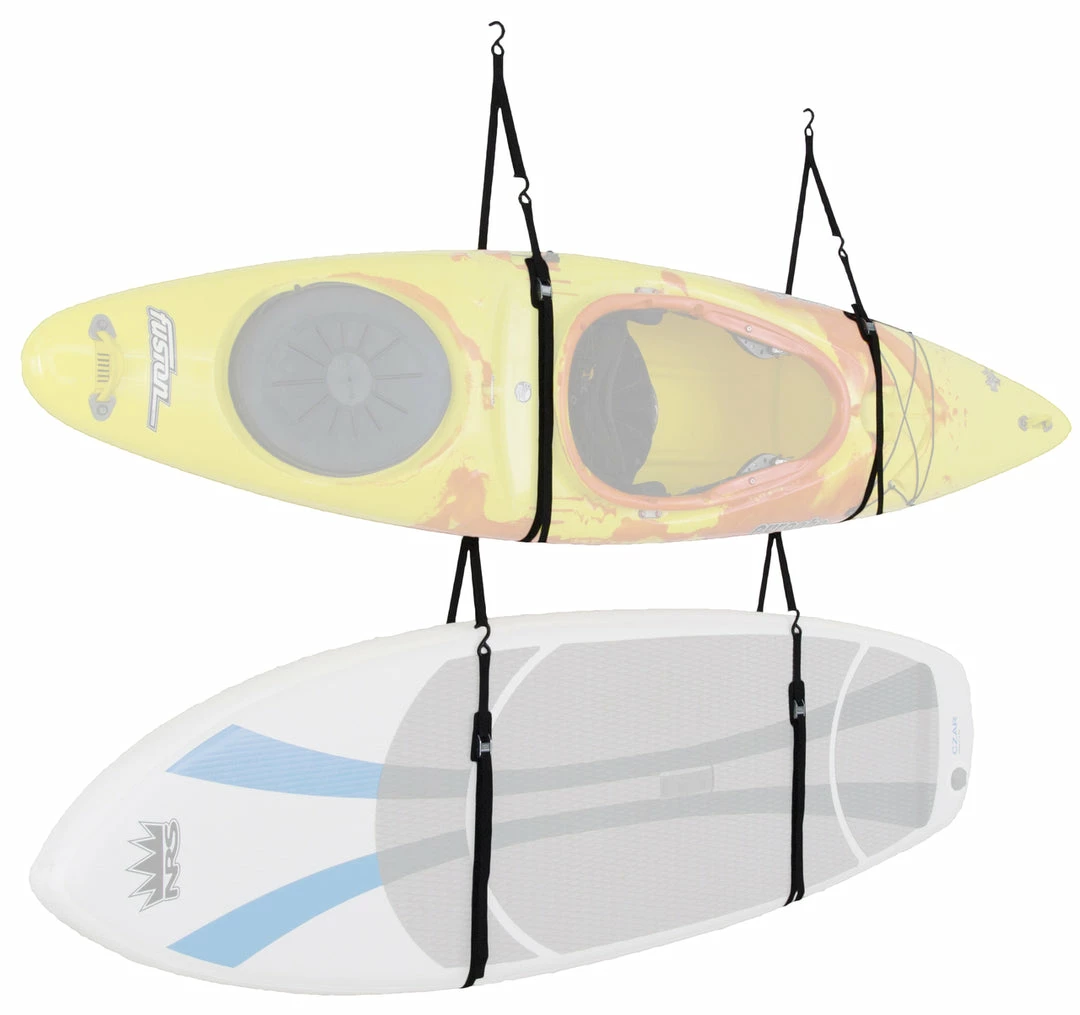 The NRS Kayak/SUP Hanger easily solves the problem of where to store your kayak. As much as you love using your kayak and love how big it is when you are out on the water, storing something that big can sometimes become quite the undertaking. Most people need all the space in their basements, garages, and sheds. This hanger gives you the ability to hang your kayak from a wall or the ceiling. This frees up your floor space while storing your boat in a safe environment. The tough nylon straps are adjustable so you have a little room to adjust. The steel J-hooks that come with this allow you to attach the straps to existing hardware or structures. There is an integrated loop on each strap so you can store your paddle out of the way. Should you have more than one kayak in your house or a kayak and another type of boat, the second set of loops on each set of straps gives you the option to hang two boats. Coming with two eye screws and instructions, you no longer have any excuse for storing your kayak!