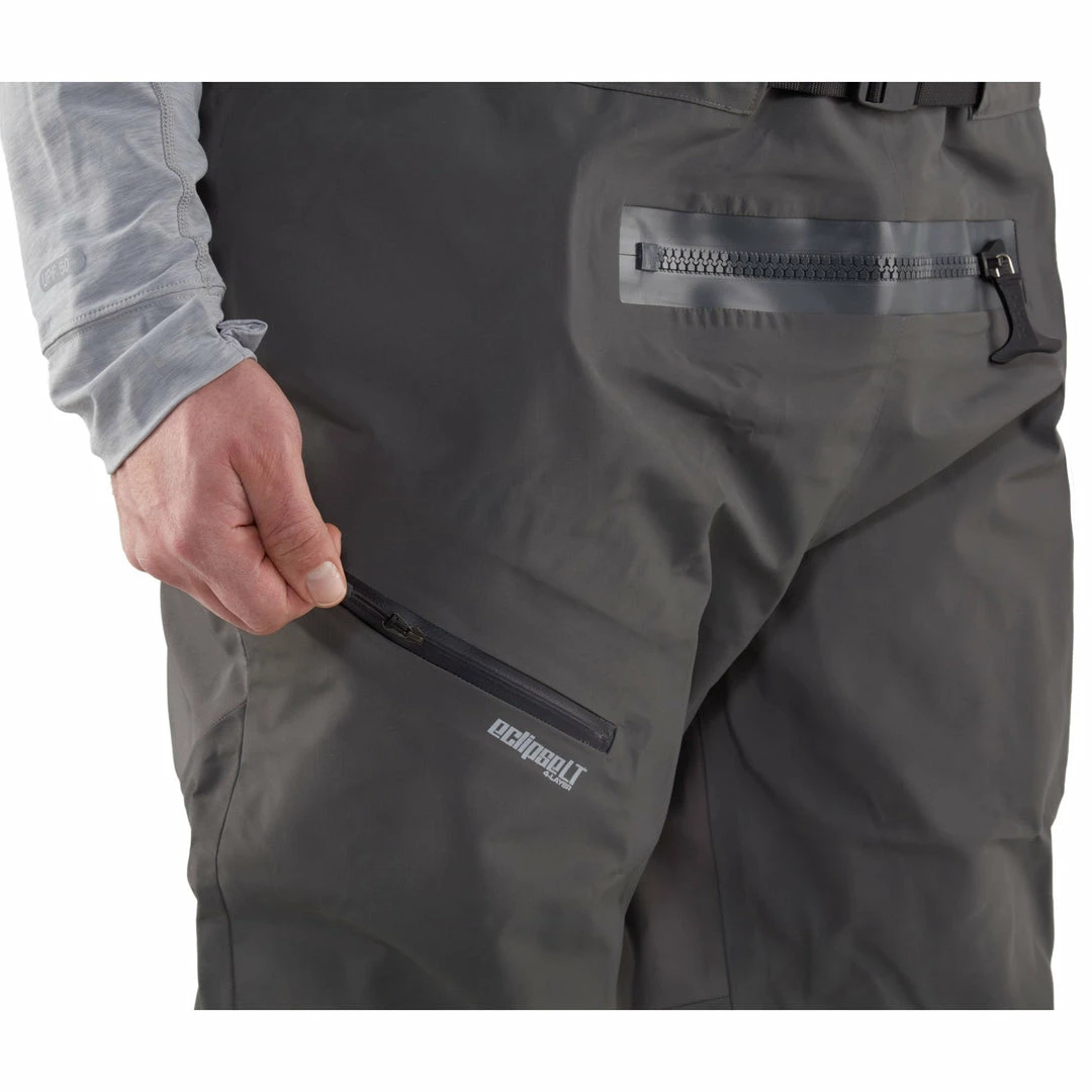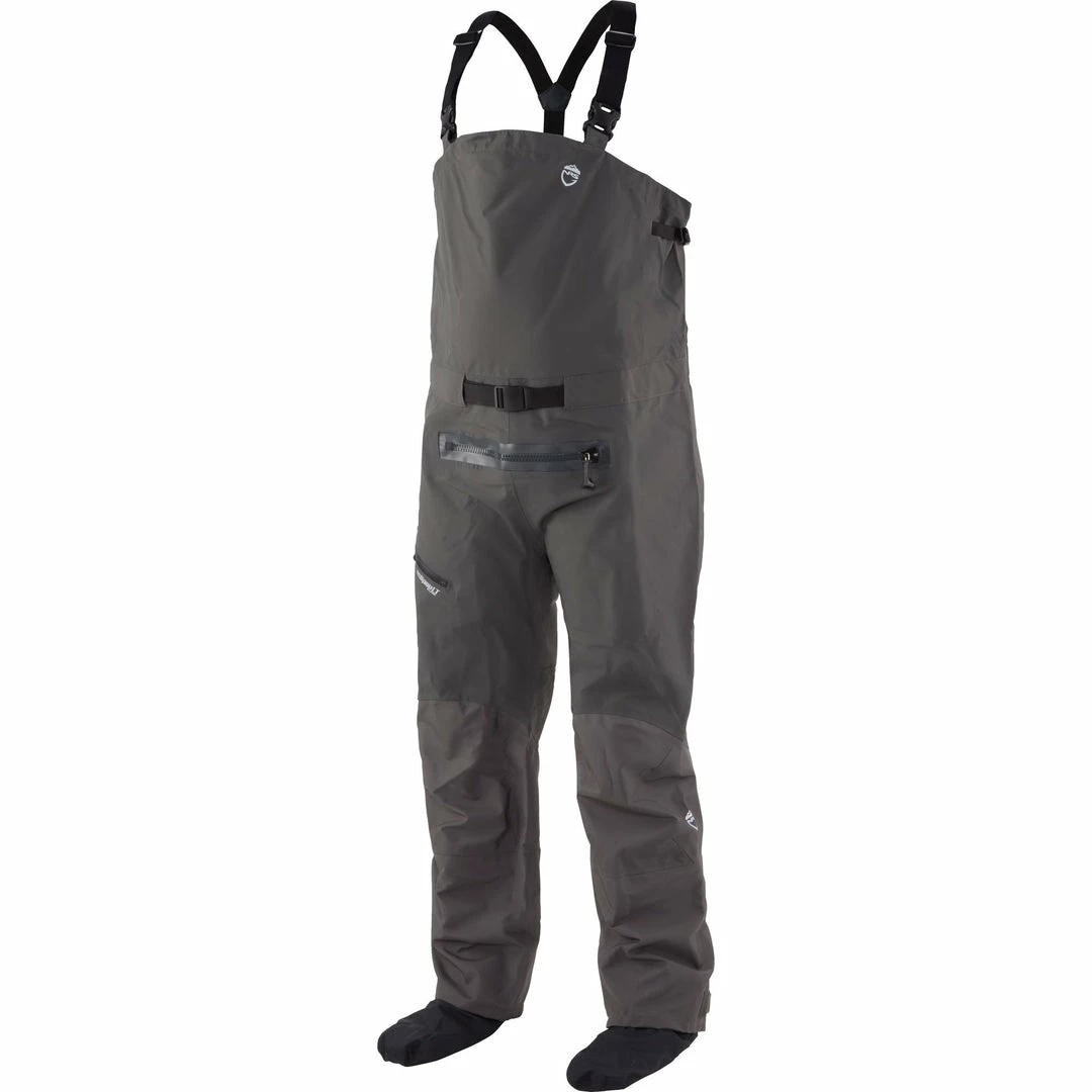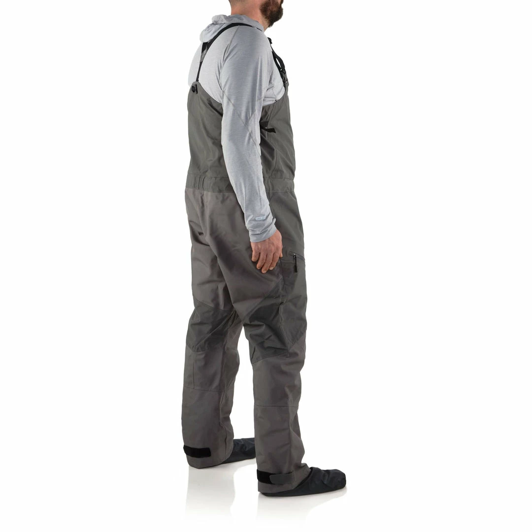 This edition of the NRS Sidewinder Bib Dry Pants can be worn as fishing waders or combined with a dry top which provides complete cold weather submersion protection. These bibs are a favorite among kayak anglers for colder weather paddling and fishing. When combined with a double-skirted dry top or paddling jacket, the Sidewinder Bibs give you a versatile dry system comparable to a dry suit. The YKK® AquaSeal® relief zipper allows you to answer nature’s call without stripping off your PFD and bibs. A fully-detachable wishbone suspender system uses nylon buckles to guarantee you won’t lose your bibs. The 4-layer EclipseLT fabric features a proprietary waterproof-breathable barrier to lock out water, all while allowing the moisture to escape. These bibs also feature a reinforced seat and legs for maximum durability. The supple polyester microfiber shell allows frictionless movement with superior resistance to punctures and abrasion. These bibs were designed for maximum comfort under your PFD, and come with two side adjustments to keep the fit snug. For added convenience, a splashproof zippered thigh pocket is also built-in to help store small personal belongings.