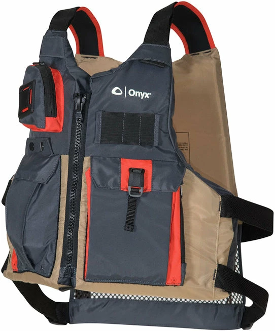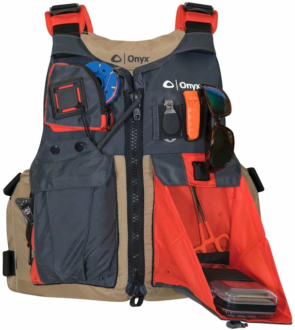 The Onyx Kayak Fishing Vest is designed with the kayak angler in mind. Plenty of pockets and space for fishing gear and accessories. The largemouth cargo pocket securely holds a VHF radio, long nose pliers, and other larger accessories. The one-button push drop-down tray pocket has a 2″ elastic strap that secures small tackle boxes.