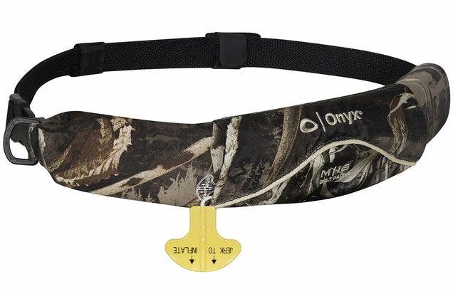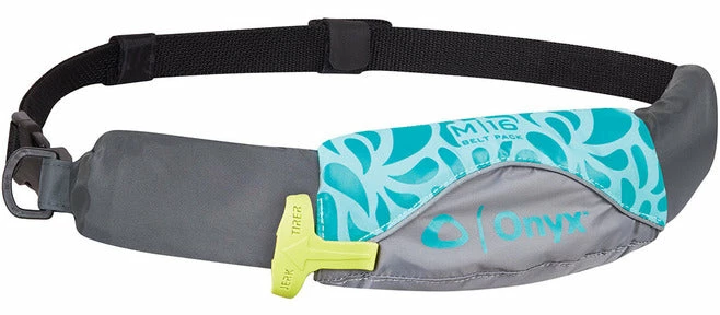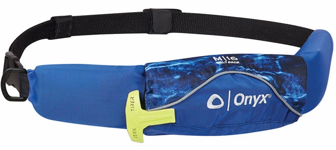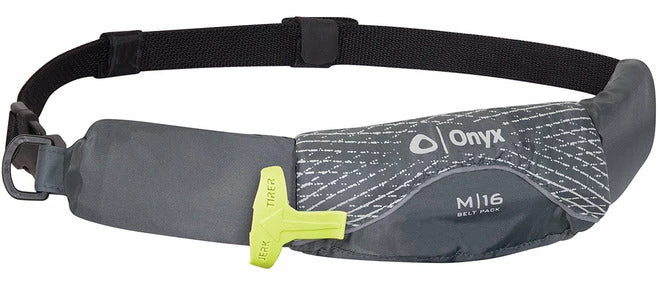 The Onyx M-16 Manual Belt Pack PFD has a unique design perfect for kayak anglers and other paddle sport enthusiasts because it does not restrict any type of arm movement. The 1″ buckle and body belt provide the wearer with an extremely low-profile flotation device. This belt is manual only and inflates when the wearer pulls the “Pull to Inflate” handle. The CO2 cartridge that inflates the belt will provide 17 lbs. of buoyancy, and then the oral inflation tube can be used to increase that all the way up to 26.5 lbs. of buoyancy when fully inflated. This belt is made for anyone 16 years of age and older and weighing over 80 pounds. Since this is a manual only inflation flotation device it is not recommended for non-swimmers or weak swimmers. This is a U.S. Coast Guard Approved Type V Life Jacket / Personal Flotation Device (PFD) with Type III Performance. The universal size of this belt allows it to fit waists up to 52″ and chests 30″ – 52″.