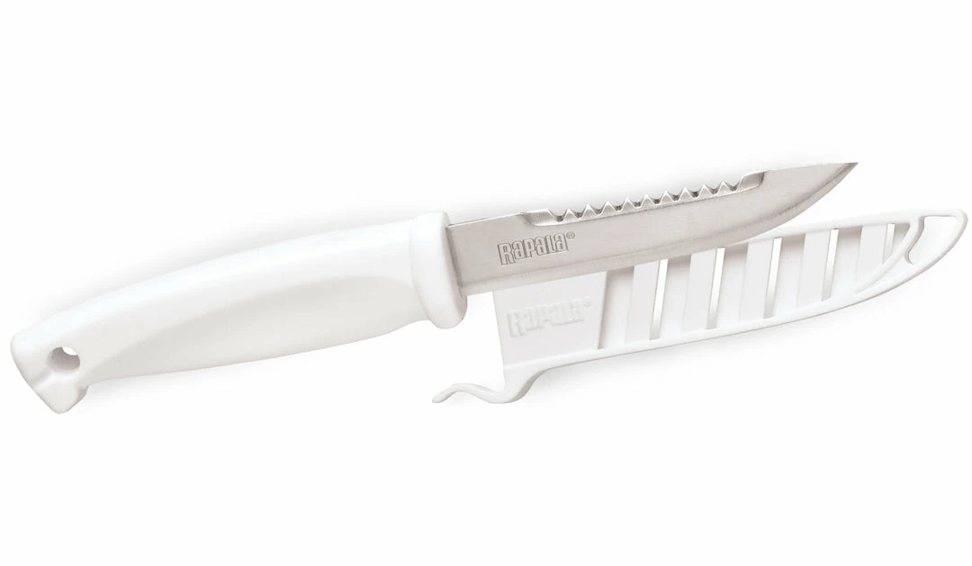 The Rapala Bait Knife is a knife you will want to have in your arsenal. This knife features a 4” serrated upper edge with a razor-sharp base-to-tip blade, which makes this knife the perfect size for preparing all your baits and many other tasks while on the water. The Rapala Bait Knife also includes an open sheath for safe storage yet easy access. Carry this knife with you on a lanyard, or hang it from the sheath loop for easy and simple one-handed usage.