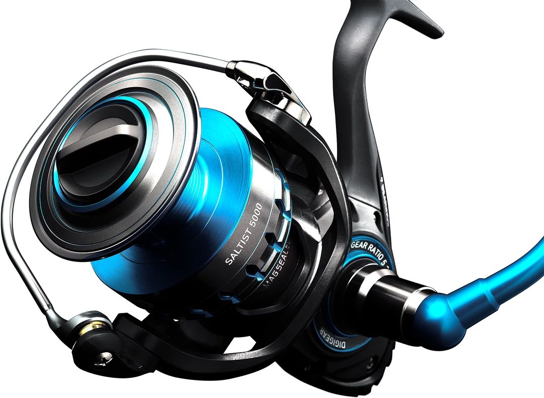 The Daiwa Saltist Spinning Reel provides the ultimate experience for any saltwater angler. These reels are specifically designed to withstand the harsh elements of saltwater angling. They are all equipped with a Magsealed main shaft, Magsealed line roller, and corrosion-resistant ball bearings. These three unique pieces come together to keep your reel smooth and performing at high quality for years. The specific type of bearings used on these reels is shown to last up to twelve times longer than the industry standard stainless steel bearings. The unique design of the air rotor reduces unnecessary weight while providing maximum strength. This air rotor weighs up to 15% less than standard rotors, adding to this reel’s lightness. This reel offers a unique design on the ABS spool. This spool is designed with a maximized core diameter and reversed taper, meaning you can use 100% of your line. You can easily fill up the spool to the edge and don’t have to worry about any tangling.