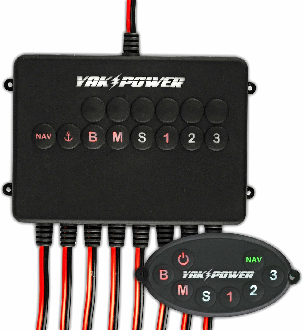 The Yak-Power Wireless 8 Circuit Digital Switcher with Integrated Bluetooth provides the angler with a whole new way to rig the electronics on their kayak. Eight circuits allow you to customize your setup and provide you with optimum use of your electronics. The integrated Bluetooth pairs with a mobile app to give you total control at your fingertips. Easily store this unit wherever it is most convenient, knowing that you will not need to access it to control the power of your electronic devices. The unit is pre-loaded with switches for NAV, anchor, bow, midship, stern, and three accessories. You can now have total control of your 12V power and electronics with just your cellphone. This unit does come with a wireless keypad controller with no cable connection, making its use optional. When the respective circuit is in the ‘ON’ position, the button on the switch box will illuminate.