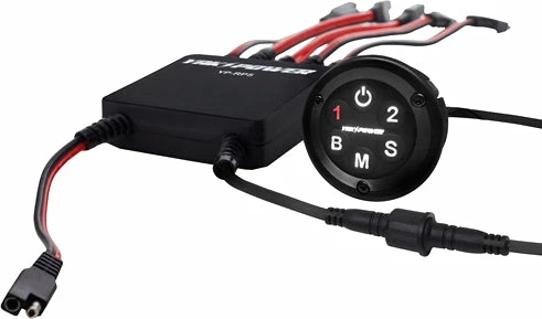 This Yak-Power Power Panel Switching System includes the controller & relay module for kayak lights, power, and charging! The Power Panel Switching System is 12-volt plug-and-play connectivity for your kayak. Why cut and splice when you can just plug and play? This Yak-Power system is designed to make it quick and easy to add and control 12-volt electronics on your kayak. With five switched outlets, you can connect your fish finder, bait well pump, LED lighting, phone charger, and any other 12-volt accessory you need while you’re on the water.